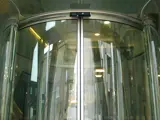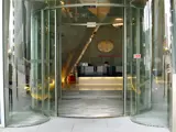 Architects AHMM specific requirements for a transparent glass drum to provide "openness and space" to match the interior of the HQ for Monsoon & Accessorize. 3m diameter and 3m high all glass sliding drum with full glass canopy.