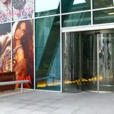 Drum set inside the building lobby and 'connected' to the main façade by bull nose curved glass with additional glass canopy to connect both drum and façade transom.