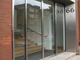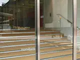 Engineer a solution where the entrance width could be divided into four equal segments so that the bi-part doors could align and hide behind the outer fixed glass panels on either side. Mechanical drives and gear engineered to cope with the additional weight of stainless steel frames and high security glazing. Secondary internal entrance screen in full glass with double door-set and fixed screens all with minimal framing.