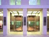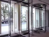 Automatic minimalist glass revolving door and automatic glass pass doors with concealed in-ground swing operator. Surrounding glass screen and glass ceiling, with stainless steel, architectural metalwork.