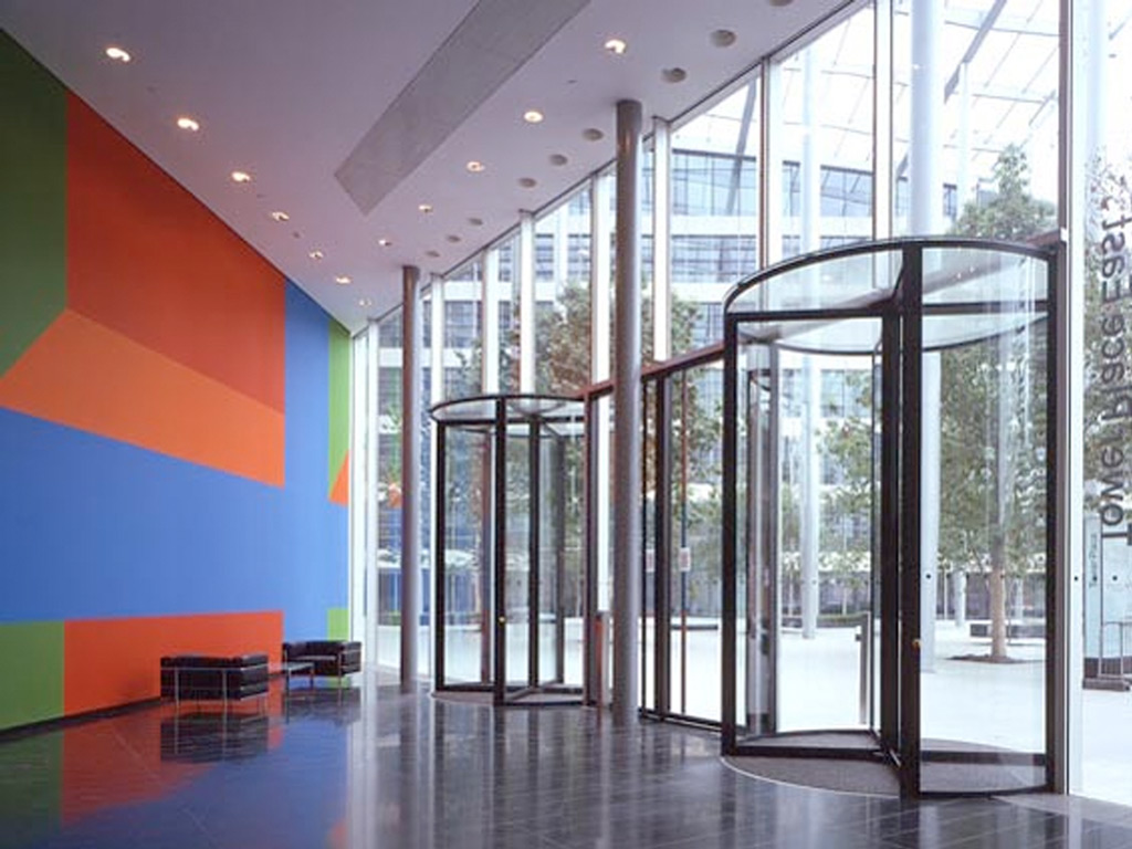 Entrances comprise of all-glass minimalist revolving doors and automatic swing pass doors with concealed in-ground automatic operators.